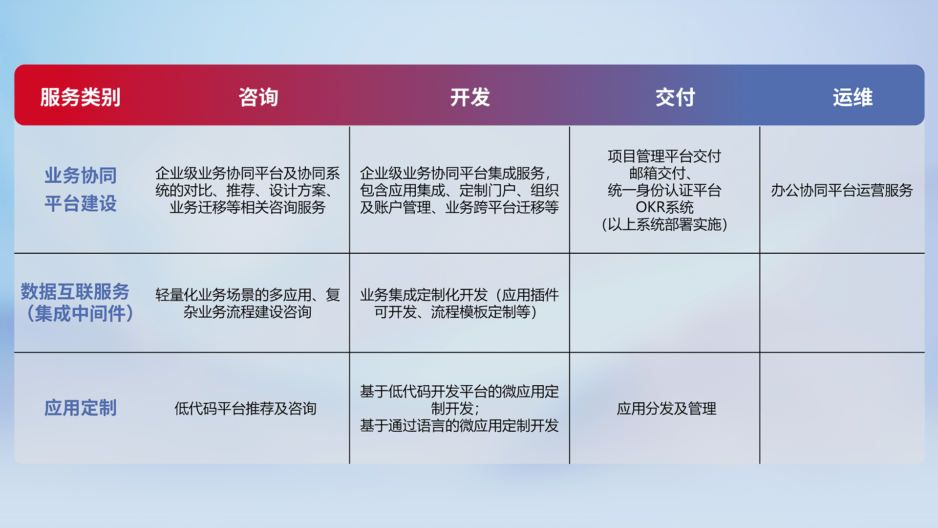 针对钉钉、、、、企微、、、、IDaas等平台级产品提供产品的规划、、方案、、交付、、、定制化开发等服务,,,实现如统一协同办公、、智能客户服务、、混合会议管理、、、、智能数据查询、、、等业务场景,,,实现数字化转型。。。