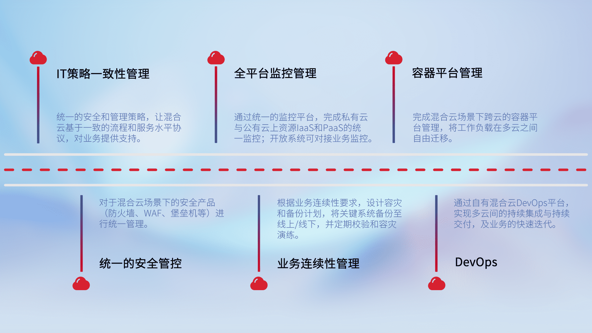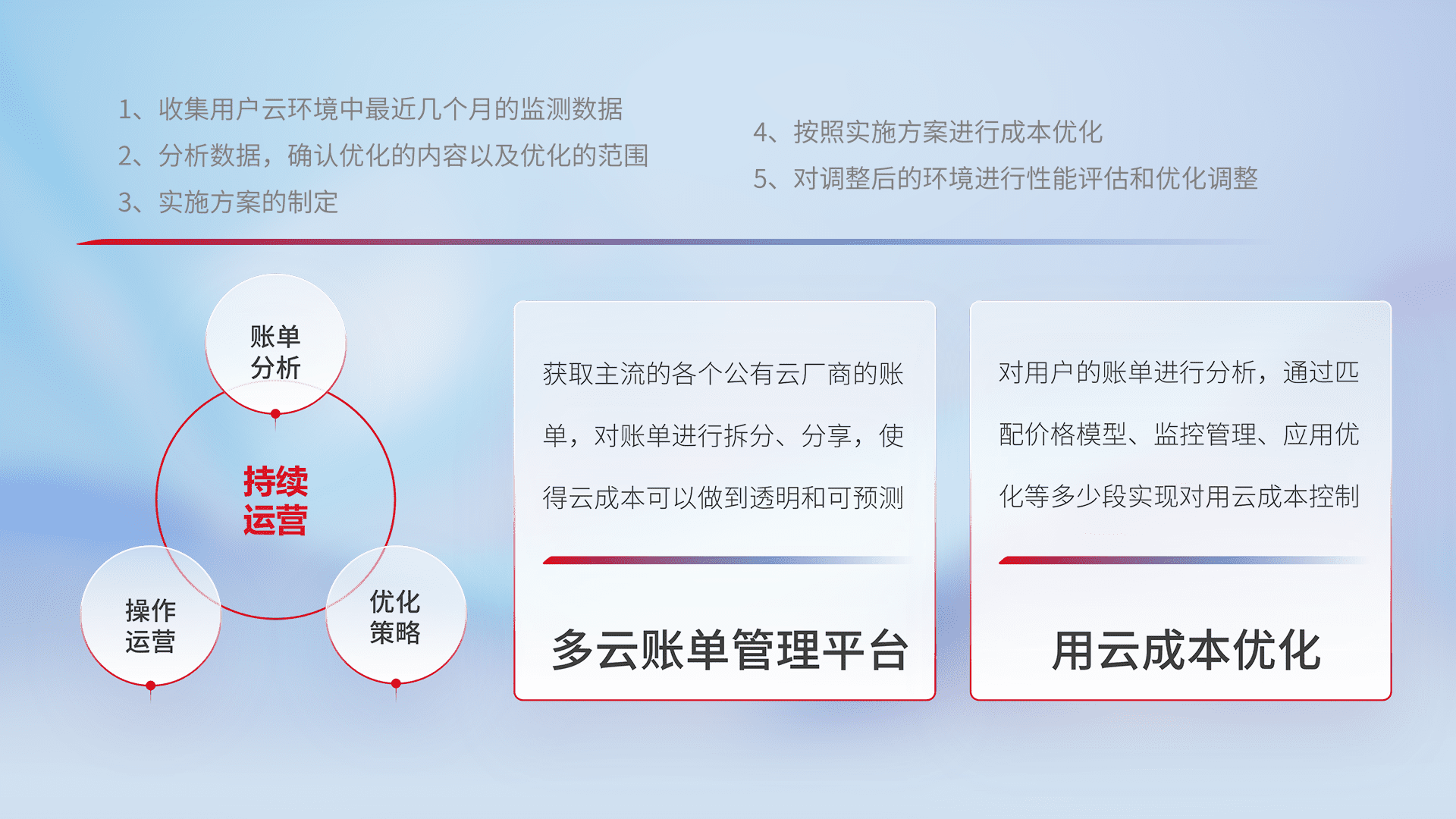 通过多云纳管,,,,以统一的资源数据模型把客户的云资源进行抽象和封装,,进而实现对多云资源的统一操作,,,,保障云资源管理的可靠性、、、稳定性与可用性。。。量身定制化运维内容,,,配置、、、、开发运维、、补丁管理、、备份、、监控、、、认证和访问管理、、、审计和日常巡检等,,,保障在用云过程中的可靠度,,稳定度以及高可用率。。。。